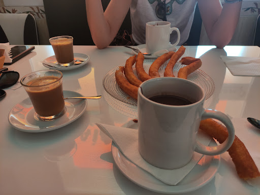 Hemos ido a desayunar/almorzar esta mañana un grupo de 9 personas y solo tengo buenas palabras que decir sobre este lugar y sobre el servicio que recibimos. Nos comentaron al entrar que la especialidad eran los churros con chocolate, los cuales iban haciendo en el momento. Nos han ofrecido uno a cada uno como detalle para que los probemos y estaban buenísimos. Tenían una oferta de chocolate (en una taza de buen tamaño) con churros (bastante grandes, parecen porras) por 5 euros. Y la misma oferta por 4 euros si pedías los churros con café con leche. Otro apunte importante para mi es el hecho de que cuenten con bebida vegetal. Hemos pedido también varias tostadas, medios bocadillos y otras opciones de desayunos, las raciones eran bastante generosas y todo estaba a muy buen precio. El servicio ha sido muy atento y amable en todo momento con nosotros. Nos ha encantado todo,...