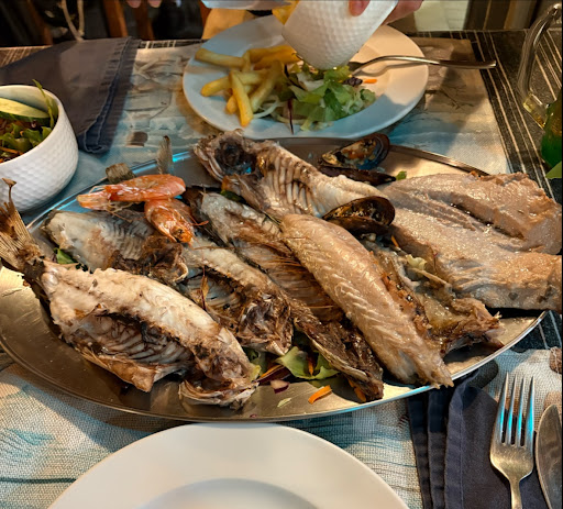 The food was great and fresh, and the prices were reasonable—especially compared to others in the area. We had the mix of the day, which included about five different fish, some mussels, and a couple of prawns. I would have preferred more prawns and mussels, but that’s on me—I didn’t ask in advance. There were only two prawns and a few mussels, but basically five whole fish! Not saying that in a bad way—it was just impossible to finish between the two of us, haha.