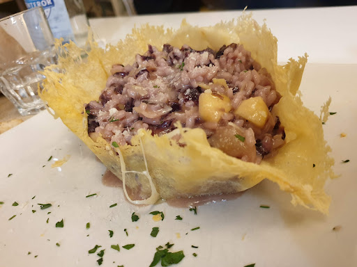 The restaurant is really small, but I loved its modern design, with plants coming out of the walls. The menu is really varied, from vegan to celiac. We started with some asparagus with bacon and parmesan cheese; I found it a little bit small as a portion, but the taste was really good. After this, we proceeded with a risotto with radicchio in a parmesan nest. In the beginning I didn't know what to expect, but then as soon as I saw the dish coming, I understood it had to be amazing. It was definitely the rice in a parmesan plate, so thick and tasteful that you will make it last until the end! Also the rice had a wonderful taste, in contrast with the bitterness of radicchio. To finish the opera, I took a great dessert: cheesecake with fig jam on, made with the local goat cheese and mascarpone. It was a little bit thick, but the taste was..wow! Service was also really good! The restaurant is run by two Italian guys who are really kind and available...