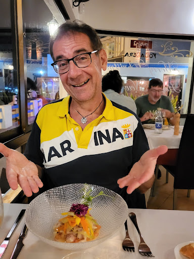 Read moreL'ultima sera della nostra vacanza a Fuerteventura, abbiamo deciso di mangiare in un buon ristorante a Corralejo. Abbiamo chiesto in giro , per questa occasione speciale che corrisponde al compleanno di mia moglie, e ci hanno nominato un sacco di ristoranti ma non il Fogalera. Di solito preferiamo affidarci al nostro famelico istinto, e così, girando per la parte vecchia di Corralejo, abbiamo fatto la nostra migliore scelta Partiamo dalla location: è proprio di fronte al porticciolo, con una grande vetrata che dà una bellissima visuale anche se si siede nella parte più interna Servizio: impeccabile dall'ingresso fino all'uscita. Siamo stati portati a braccetto in ogni momento della nostra cena. Ci ha fatto gradita sorpresa la 🕯️ sul dolce di mia moglie 😘 Come si mangia: qui viene la parte più difficile perché non so trovare le migliori parole per dare un'idea della qualità. Comunque: antipasti -io ho preso un ceviche di corvina , mia moglie chipirones en crema ( seppioline su crema di ceci) e già li eravamo stupiti dalla freschezza e dai sapori dell'Oceano. Secondo: raviolo negro ( al nero di seppia con ripieno di branzino) di un delicato sapore di mare. Io..eh! Ho pianto.. la prima volta che ho assaggiato una zuppa di pesce ( qui sopa de pescado ) è stato 30 anni fa ad Ajaccio in Corsica ed ero rimasto deliziato. Non sono più riuscito a trovarne una così buona in giro per il mondo, finché non sono arrivato a questa sera.. ragazzi! Vi consiglio di tuffarvi in questo piatto perché vi lascerà senza parole per come sono gestiti i sapori! Non smetterò mai di ringraziare lo chef e la ragazza che ci ha accompagnato per la cena, che ci ha suggerito le scelte Vino: visto che non siamo riusciti ad andare a Lanzarote, abbiamo scelto la loro Malvasia: anche questa si è rivelata eccezionale per completezza di profumi e sapore ( leggermente fruttato con un buon ritorno di pesca). Dolci : ottima scelta anche per il tiramisù ed il semifrio di amaretti. Il conto ci è sembrato ottimamente adeguato alla qualità del cibo, alla quantità, al servizio e alla location. Lo straconsigliamo se volete una cucina raffinata, mediterranea certamente, con quel tocco magico di Italia che nel cibo non guasta mai. Un'ultima considerazione su recensioni che ho letto: siate sinceri e coerenti perché vedere scritto che il locale è caro quando i prezzi sono esposti nel menù è una pura assurdità! Così come leggere di gente che conta le vongole presenti nel proprio piatto senza fare riferimento alla qualità del piatto è un'altra scusa per essere solo critici senza portare un fondo di verità. A queste persone consiglio i loro Mac..eccetera. GRAZIE FOGALERA PER AVERCI EMOZIONATO CON LA VOSTRA PERSONALITÀ PRESENTE IN OGNI PASSAGGIO DELLA NOSTRA CENA Lascio parlare anche le foto a testimoniare...