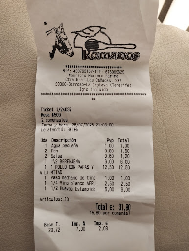 Y como broche de gala al llegar a la caja para salir: Le decimos al empleado el número de nuestra mesa. Teclea en su equipo y nos saca el ticket por un total de 41 y pico euros. Visto lo visto, le indico a mi esposa que repase la cuenta. Ve algo raro, y entonces empiezan unos a otros a: ver, mira y dime. Total que se habían equivocado (en su contra) pues al final fueron 47 y pico por no se que royo de numeración de mesas.