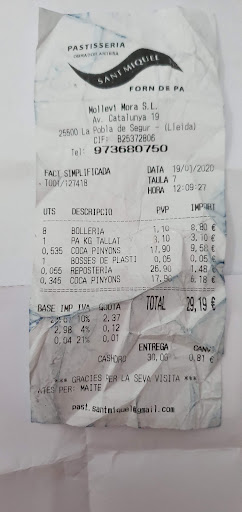 Read moreMal una decepción es la segunda vez que fui a esta pastiseria y me cobraron una coca de pinyons x una una coca de pa carisiimo un robo a la cara total y cuando me saco la cuenta del total reviso el tiket y le pregunto a la señora que me atendió perdona pero no me estoy llevando ninguna coca de pinyons y me parece muy caro y me dice si cobramos igual yo trabaje en alguna pastiseria del pallars y a la coca se le llama x el nombre y se le cobra x lo que es en este caso sabemos que el pinyons es carísimo pero yo no me lleve ninguna coca de pinyons Por lo tanto las personas que no vivan en la zona o el lugar preguntar primero los precios xk a la hora del pago te sacan el ojo por no decir te...
