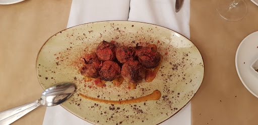 Read moreUn restaurante con productos de excelente calidad. La entrada al restaurante no está muy bien indicada, hasta que no estás casi delante no ves el gran cartel, sólo ves un pequeño cartel de una marca de cerveza. Una vez dentro, se respira un ambiente a casa de pueblo cuidada y resaltando sus muros de piedra natural. Una estufa de gas butano caldea la estancia del comedor. La carta está muy bien surtida de platos para todos los gustos. Tras degustar de entrante las alcachofas fermentadas con salsa Ras al hannut y calamar de playa con alioli negro y mojo picón se despierta nuestra curiosidad para saber si el plato principal estará a la altura de los entrantes, y efectivamente, no sólo está a la altura, sino que lo sobrepasa con creces ya que el chuletón de rubia gallega madurado summun al punto, está realmente delicioso. Ahora es el turno de los postres, ¿nos continuará sorprendiendo gratamente?, no, ha fallado el punto de dulzor de la calabaza con chocolate ya que tras 2 horas de horneado para el caramelizado de los azucares, no ha funcionado ya que la calabaza no era de buena calidad (en referencia a cantidad de azucares). Toda esta comida la disfrutamos con sangría realmente deliciosa. Tengo que volver para probar sus arroces que según he leído,...