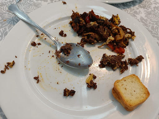 Tarabico bar leads to the shop for embutido on the left or to the restaurant. There are also plenty of tables outside in front of it. We had some drinks and tapas (jamon and chorizo or cheese and sardine on a piece of bread) which felt refreshing after a small treck nearby. We decided to stay for lunch and luckily a table was available. There is no menu of the day so you order from the menu. We had morcilla, carillera and pollo de coral with langostino and sourdough bread that was freshly made and mega tasty. Even though the chicken meat was so soft I am not so sure of mixing the flavour with seafood. Therefore my favourite dish was the carillera with chips. As dessert we ordered a tarta de turron and coffee. Not sure what I expected of the cake but the flavour and texture reminded me of a creme brulee. Bar staff and waiters were lovley...