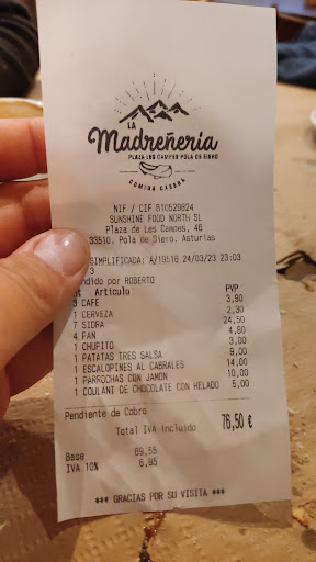 Read moreLa comida muy buena, la atención deja mucho que desear. Consulte a la camarera en qué consisten algunos platos que más me llamaban la atención, ella muy amable trató de explicar sobre dichos platos, luego me dice que mejor venga el dueño y me explique mejor, dado que ella no era de aquí y recién comenzaba a conocer la gastronomía del lugar. Vino el dueño con muy mala gana y me explicó a los gritos y muy mal modo... a tal punto que unos comensales, vecinos del lugar, se metieron en la conversación y me explicaron muy amables. El dueño se dio cuenta de su actitud y bajó un cambio... es una lástima porque uno desea conocer a fondo todo lo que representa a esta hermosa región de Asturias. Ha! Cuando fui a abonar... el trato que brindaban a la camarera, madre mía!!!...