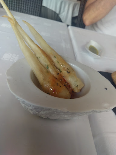 La primera atención hasta que te pasan a la mesa fue muy agradable. Pedí un menú y elegí canelones de setas con virutas de foie, de segundo solomillo con base de patata, de postre brownie con helado de vainilla. Una vez pides te traen un entrante de parte de la casa para la espera que era un langostino enrollado con algo y una salsa como de tomate que la verdad estaba espectacular el entrante, además también te dan a elegir pan y te ponen un aceite especial de oliva para probarlo durante la espera.