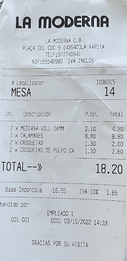 We were staying at our friend's yacht in Sant Carles de la Rapita Spain and they very kindly brought us to la moderna for lunch, along with some of their other friends who live on the Marina also. What a hidden gem this charming little restaurant is. The menu is very very good. We ordered a selection of tapas for the six of us to share, and the nice thing was they had plenty of vegetarian choices for me. The food was so delicious, especially the potatoes bravas and the tomato and mozerlla salad, my husband and other friends really enjoyed the eggs and chips dish, I know it doesn't sound very Spanish..but it was. The premises are spotlessly clean, the decor very lovely and staff helpful attentive and so welcoming to us, very good value for money, including 2 bottles of excellent Rioja it was 35 euro per couple, and that included a tip. Next time I visit San Carles de la Rapita, I will be back to La Moderna, highly...
