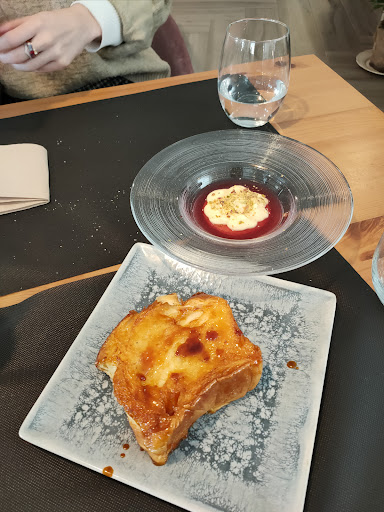 De postre pedimos crema de limon con frambuesa y pistachos, un postre realmente rico, es un bizcochito con crema de limon encima muy suave salsa de frambuesa alrededor y crunchi de pistachos por encima, por lo que el sabor que mas destaca es la frambuesa. Por otro lado pedimos la torrija con leche caramelizada en el momento, este postre no sabria describirlo bien, la textura y el sabor son inigualables y no se parecen en nada a las torrijas tradicionales, sin duda un postre que debeis...