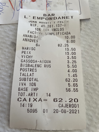 Read moreDesprés de demanar recomanacions per la zona anem a L’Empordanet. La veritat és que el local té la pinta d’un restaurant d’aquells de carretera que trobes en moltes carreteres del país. Aquest, però, queda una mica més amagat a La Tallada d’Empordà. Això fa que sigui menys turístic que els que hi ha prop de la platja. I això es veu per la mena de cliantela que té i per com està decorat l’espai. La carta la tenen penjada a la paret i hi van ratllant els plats que s’acaben. Et diuen que hi ha el plat del dia que és una amanida i de segon alguna carn o peix del dia. Pel que fa a altres plats, especialment els de llagosta, s’han d’encarregar abans. Avui hi hem anat 2. Hem fet un tomàquet amb formatge fresc, unes zamburiñas, unes anxoves i xipirons a la planxa. També postres , aigua i cafè i hem pagat una mica més de 30€ cada un. La veritat és que tots els plats eren molt bons. El tomàquet estava bé, però tampoc era molt gustós. El plat era abundant, però per 10€ ja ho podia ser. Les anxoves i especialment les zamburiñas, que es paguen a 2,25€ la peça, sí que eren molt bones. Finalment els xipirons també eren bons, però no eren nets de dins. Ens han dit que quan tenen temps els netegen, però que habitualment els fan així. Eren molt bons, però és molest anar traient la ploma mentre els mastegues. Les postres també estaven bé. Un local recomanable si es vol sortir de les zones més turístiques i diuen que és molt recomanable els plats de llagosta. Un altre dia...