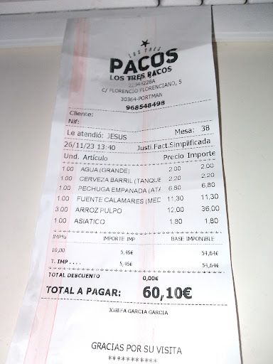 Read moreEstuvimos en el Bar Los 3 Pacos de Portman y la verdad es que salimos encantados. El servicio es súper rápido, y los camareros muy majos y atentos, lo que siempre es un punto a favor. La comida, increíble. El arroz con pulpo estaba de escándalo, las tortillitas de camarones crujientes y deliciosas, y los calamares a la romana buenísimos. Además, las cervezas estaban súper frías, perfectas para acompañar la comida.