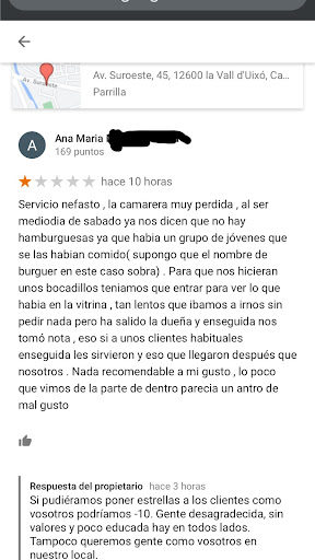Read moreServicio nefasto , la camarera muy perdida , al ser mediodia de sabado ya nos dicen que no hay hamburguesas ya que habia un grupo de jóvenes que se las habian comido( supongo que el nombre de burguer en este caso sobra) . Para que nos hicieran unos bocadillos teniamos que entrar para ver lo que habia en la vitrina , tan lentos que ibamos a irnos sin pedir nada pero ha salido la dueña y enseguida nos tomó nota , eso si a unos clientes habituales enseguida les sirvieron y eso que llegaron después que nosotros . Nada recomendable a mi gusto , lo poco que vimos de la parte de dentro parecia un antro de mal gusto En vista que no les gusta las malas críticas contestan por mensaje privado, señores recordarles que es un servicio público y están para las buenas y para las malas , fuimos muy educados tal vez demasiado para el servicio tan negaso que nos dieron , por otra parte añadiré que desinfectaban las mesas con limpiacristales . Casi dos horas para comer unos bocadillos y medio menú , no se molesten en contestarme por privado hasta aquí llegaría mi buena educación , y ya que no quieren clientes como nosotros tranquilos ya mis conocidos y allegados saben donde no han de...