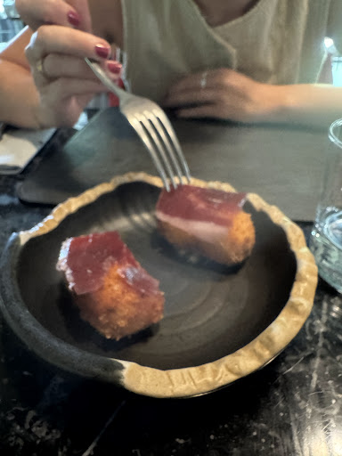 A part del menú, també vam demanar dues croquetes de pernil —espectacularment bones— i una galeta de foie, també molt bona.