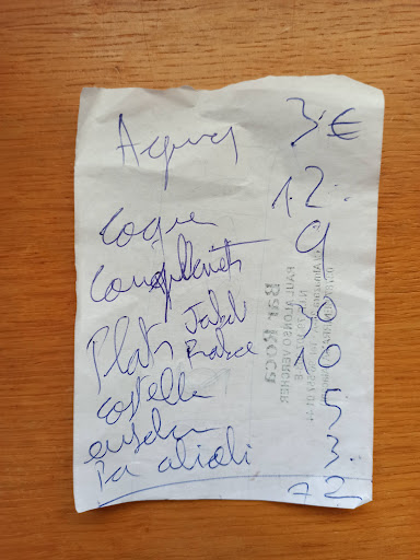 Como ya vemos de que esto va esto y va ser todo dinero negro sin declarar IVA, le pedimos que nos haga una factura. Vemos que no le sienta nada bien porque vocifera por el local porque los forasteros le han pedido una factura. Al final nos entrega el papel que adjunto en la reseña, ahora suma 72€!, ni número de factura, ni IVA ni NADA!