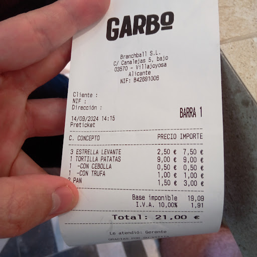 Read moreTras ojear la carta nos decantamos por la tortilla con "trufa". Le decimos que la queremos poco hecha y nos preguntan: con cebolla? Si claro! Pese a que el bar estaba casi vacío, las tortilla tardó 25 minutos en salir. La tortilla con un tamaño de PLATILLO DE POSTRE, sin el punto que pedimos. No nos ponen pan así que le pedimos. Otros 15 min para dos trozos de pan recién horneado / ardiendo (Pan congelado). Pedimos la cuenta y observamos: Cada trozo de pan congelado 1,50€. Uno ni lo pudimos tomar de lo caliente que estaba cuando lo sirvieron. Ponen un suplemento de 0,50€ por la cebolla. Cuando veo esto casi me explota la cabeza 🤯. Tras comentar este inusual detalle que no venía explícito en carta con los encargados, me comentan que es un tema de dirección. Auguro grandes éxitos a este...