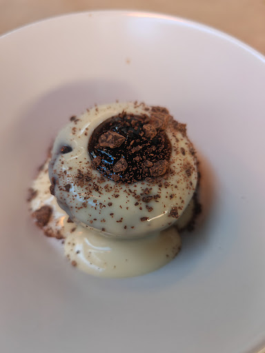 Pero la decepción más grande ,y con diferencia, ha sido el postre. No nos han dado a elegir, era el postre que entraba con este menú del chef y era como una especie de coulant de chocolate con toda la pinta de venir ya hecho al cual le habían añadido por encima una crema no recuerdo de qué y una salsa de nardo...estaba demasiado empalagoso. No se distinguían sabores, no había contrastes, era todo mega dulce.