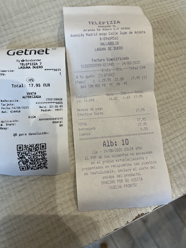 Read moreMuy mala gestión,me desplazo 8 km después de media hora de encargar las pizzas por teléfono ,y no las tenían preparadas,me dicen que espere 30 minutos vuelvo y no están listas,que tengo que esperar otros 20 minutos y me exige que le PAGE en ese momento,me niego y le digo que cuando estén las pizzas le pago,vuelvo a los 40 minutos y no están las pizzas,le digo que lo deje y me marcho,nos fuimos al burger,cuando llegamos a casa hora y media después de cenar me llaman para recoger las pizzas,un caos total una mala gestión fuera de lugar,por unos niños que no saben ni coger los pedidos que pueden gestionar ni anular un pedido,encima me amenazan como con ponerme en un registro de morosos del Telepizza,ya sabéis dónde...