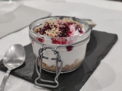 In English: what a lovely place. The service was amazing (way too fast for what I am used to xd) and the food and drinks were incredible. We had the white wine of the house, it was super soft and refreshing for a hot day. The food we ordered crockets with cheese and another type of crockets that were made with squid ink. I wish I had order one for myself at the end as we had it to share (they were good portions i just wanted to be selfish and have more for myself). We also had a gazpacho, pimiento padrón (is like a green pepper in salt and olive oil) and huevos rotos con cecina ( these are eggs and a thin sliced beef with potatoes). In hindsight I should have taken photos of the foods but it was too late when I remember to do so. So i only have photos of the desserts which are made in house, and it felt like I was having my grandma's desserts that she used to make. We had the cheese cake, brownie with ice cream and quince cheese (again the photo was not taken my mum really enjoyed it before i could get a photo). The only thing I will say the menu is in Galego which was a bit difficult to understand. But the waitress was very patient and explained everything as best as she could. If you are around Lalín I would seriously recommend this place for a lovely evening meal. The prices are alright but with the food you are getting I think it is very cheap.