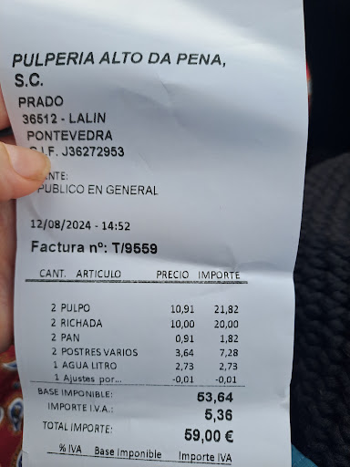 Cuál fue mi horror, al ver la cuenta?? el amigo nos apunto dos raciones de pulpo y dos de carne richada. Saliendo a 23 € por cabeza!!!. Una ración abundante de pulpo y una tartera de patatas con pimientos y trozos de carne...ni que hubiéramos cenado langosta!! La verdad que me quedo muy disgustado con la sensación de que se han aprovechado de nosotros. Si pides UNA RACIÓN de cada cosa, sin ni si quiera ver la carta, al menos esperas que te avisen o te pregunten (yo no tengo porque saber los tamaños de las raciones que pueden poner en un restaurante en medio de una carretera...)...muy defraudados con la experiencia y para nada recomiendo a nadie pasarse por ahí, o si lo hacéis espero que este comentario os sirva para andar con cautela al ordenar...