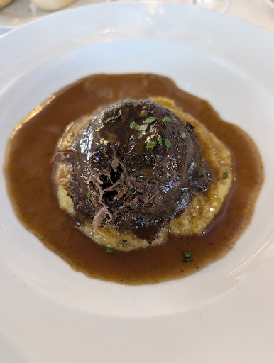 Una carrillada al vino tinto cocinada a la perfección, melosa y con una salsa potente sobre base cremosa.