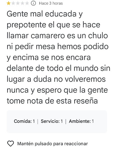 Read moreHe visto está reseña y no he podido resistirme a responderla, ya que he estado presente cuando supuestamente ha sucedido dicho acto, el cual es una falacia. Estáis afirmando que el personal es maleducado y prepotente, cuando de forma despectiva criticasteis su trabajo, insinuando que deberían abandonarlo, menospreciando cierta profesión. Como bien decís el que se hace llamar camarero, es el encargado, el que les explico con amabilidad y paciencia que las reservas son hasta las 13.30 (cosa la cual no quita que ustedes acudan y coman a las 15.00, por ejemplo, pero sin reserva). Esclarecéis que se les encaró, pero eso es erróneo, ya que realmente el que se encaró (y de echo agredió, con un golpe en la nuca) fue el propio cliente al encargado, el que no perdió sus papeles como otros y mantuvo la calma en la situación, ya que no requiere más que un saber estar y un respeto hacia las demás personas. Acto seguido el cliente salió del establecimiento gritándole que se quitase las gafas para pegarle, mientras a su vez procedía a sacar el dedo y a tocarse los glúteos burlándose de manera ofensiva en medio de la terraza para llamar la atención de otros clientes, quienes se quedaron anodadados con la reacción tan iracunda de dicho cliente, ya que no era de esperar porque en el establecimiento abunda el ambiente sosiego. Al marcharos dijisteis gritando que pondríais una reseña para que la gente que quisiese acudir al establecimiento la vea, pero al hacerlo se os olvidó escribir vuestra parte, la cual me parece más importante. Concluida dicha corrección de la reseña, yo si os recomiendo los días raros como bar para tomar algo, comer… Ya que acudo bastante y la gran mayoría de personas salen muy satisfechas tanto con los productos gastronómicos como con el trato del personal...
