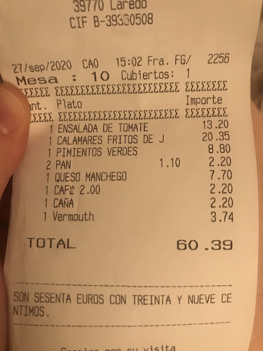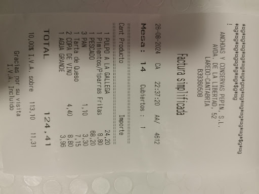 Read moreAyer domingo de S.S. pasamos con la intencion de comer algo rápido y ligero. Un bar restaurante normal pequeño, nada del otro mundo. Lo primero al pedir carta nos dijeron que no funciona el código QR para descargarla, y nos señaló un cartel en la cristalera donde habia varios platos, todo sin precio. En su terraza que hacía bastante fresco sino frio ya, pedimos sólo 4 cosas para compartir entre dos : Una ensalada de Ventresca, un revuelto de huevo con perretxikos, una ración de pimientos verdes y una ración de Rodaballo ( sólo ración , no entero ). Y repito, estas 4 cosas a compartir. Más 2 cervezas, repetimos 2 cervezas mas ( total 4 ) y pan. Todo elaboración muy normalita, estaba bien de sabor, pero todo muy sencillo elaboracion. Total unos 105 € " de nada " . Caro, no,...lo siguiente; para no volver en la vida ni a tomar un zurito ni unas rabas. No sólo no lo recomiendo, sino que lo desaconsejo. No se puede aprovechar a " sablear" ni timar a la gente. No suelo nunca dejar ni buenas ni malas. En esta ocasión sí; lástima en ese momento no haber reaccionado - pagó mi pareja - para pedir mi ro reclamaciones ( culpa nuestra ) o haber sacado foto del...