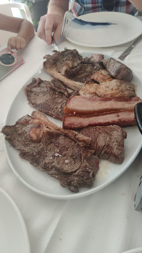 Het eten was top, we hebben foodsharing gedaan. Als voorgerecht hadden we scampi in look, die waren heerlijk en de lookboter was heerlijk pikant, ook een schotel met zeevruchten die allemaal lekker bereid waren met een lekker sausje. Ook hadden we sint-jacobsvruchten en gamba a la plancha, beiden top bereid met heerlijk grof zeezout. Als hoofdgerecht hadden we het vleesmenu (voor 2 personen, maar je kan er gerust met 4 van eten, zeker met een voorgerechtje erbij). Het bord lag vol met heerlijk gebakken vlees (biefstuk, kotelet, buikspek, cote a l'os...), weer bestrooid met grof zeezout. Het vlees was allemaal bleu gebakken maar op tafel komt er ook een klein fornuisje met een pan en kan je je vlees verder garen indien gewenst, of terug opwarmen als je te lang bezig bent met de schotel. Na de copieuze maaktijd nog een klein vanilleijsje als afsluiter, heerlijk luchtig ijs, maar ik vermoed niet zelf gedraaid. Bij het vleesmenu hoort ook nog een fles rode wijn, en ik vond hem voortreffelijk passen bij het vlees. Het enige puntje van kritiek dat ik kan geven is dat er op het vlees een beetje meer peper mocht gestrooid zijn. De bediening kon jammer genoeg niet tippen aan de kwaliteit van het eten, ofwel hadden de dames er geen zin in, of hadden ze teveel stress omdat ze onderbemand waren, ik weet niet wat de oorzaak was, maar een vriendelijke glimlach of alstublieft kon er bijna niet van af. Als we drank bestelden werd er af en toe een drankje vergeten of kwam het na 10 minuten op tafel. Heel spijtig, want de mensen in de keuken verdienen een pluim voor hun kookkunsten. Ik kan enkel maar hopen dat de bediening met een offday kampte. Er zijn wel heel veel plaatsen in het restaurant en ik vraag me af of er niet te weinig personeel rondloopt voor zoveel couverts. De sfeer in het restaurant is redelijk gezellig en als de buitenkeuken in gebruik is, is dat waarschijnlijk nog gezelliger, alleen was het redelijk rumoerig (Wij zaten op het overdekte deel van het terras achteraan). Conclusie, met een vriendelijke glimlach had dit zeker een 5 sterren geweest. Vooral met de toch heel schappelijke prijs van 207€ voor 4 volwassenen en 1 kind (+2 kleine kindjes die niet...