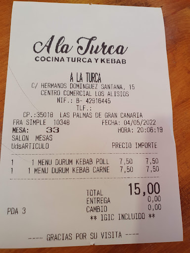 El precio estupendo, como se muestra en la foto por 7.50 tienes un menú de durum con papas y refresco, las papas acompañadas de salsa de yogurt e inclusive pedimos salsa picante y no nos la cobraron. La camarera que nos atendió, una chica de pelito pelirojo, en todo momento nos ayudo con nuestras dudas y nos atendió super bien ofreciéndonos al final un te turco. Sabor de la carne tanto del durum de pollo como el de ternera . Nos encantó.