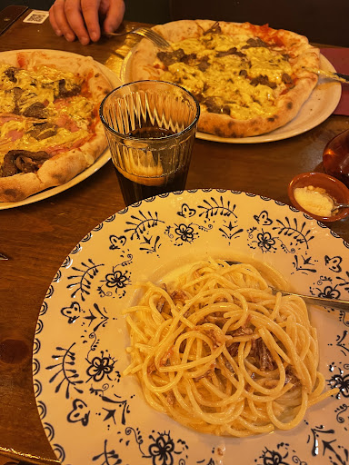 ¿La comida? Pufff... ¡¿Qué decir!? Sin palabras de buena. Bueno, unas pocas sí; ;) Como gente no muy pudiente, y que estamos más acostumbrados a comer las pizzas de ciertas franquicias, el probar 'Pizzas' de un local como el vuestro, nos hace entender aún más, que es mejor ahorrar y comer bueno, que llenar el estómago de comidas no tan buenas. Nuestro Menú fue; 2 Panes de Ajo, 2 Pizzas 'Capri', 1 Tiramisú, 1 Botella de Agua, y 1 Cerveza 'Hamstel 0,0'. Las bebidas; bien. El postre; muy bueno. El 'Pan de Ajo', bastante rico. Y la joya de la corona, las 'Pizzas'; Como diría nuestro querido y universal fontanero del 'Pequeño-Gran Mundo de los Videojuegos': 'Super Mario'... ¡¡¡ Mamma mia !!! Se nota que saben hacer las cosas bien, con una masa muy buena, ingredientes buenos, y un resultado final, que está riquísimo y no se olvida. Buf, llenas el estómago de comida que no está en ningún otro sitio. Se nota que no es algo precocinado, sino que está hecho en el momento, con trabajo. Muchas Gracias por ello. Seguir describiendo es una tontería, hay que ir y probarlas, después de todo, por eso tienen tan buena fama, y por eso hay que esperar para poder sentarse a comer, según el horario.
