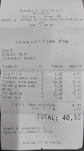 Read moreJust came back from Arepera La Criolla. Noisy place with hectic atmosphere, mostly because of locals eating there. Locals are always a good sign in a restaurant👌. The food ... absolutely fantastic. After 4 days in Las Palmas, eating in expensive restaurants, I was starting to think that there is no place to eat something memorable. Until today. Even the mojo sauce is something else than what others give you - higher class. The owner is very friendly and helpful. Too cheap in my opinion for the taste...