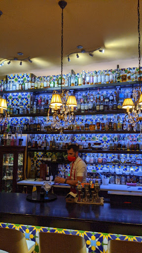 Este bar destaca por su decoración ecléctica y cuidadosamente pensada. Con estanterías llenas de libros, figuras de inspiración africana y muñecas de colección en su escaparate, parece un lugar diseñado para invitar a la reflexión y al disfrute de conversaciones profundas. La iluminación de la vitrina de botellas aporta un toque sofisticado, creando un ambiente elegante y acogedor.