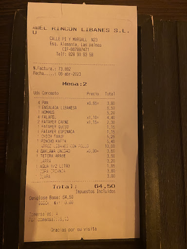 Read morePongo 1 estrella porque no me permite poner 0. ¿Quieres comer en un sitio con mal servicio, con poca educación, lento y sin sentido de la decencia alguno? Este es tu sitio. Llegamos y aparentemente nos iban a atender rápido o eso parecía con las bebidas y su veloz llegada a la mesa. No era más que un espejismo que se disipó al pedir la comida. Traen hummus que directamente viene sin pan, asi que salvo que te guste comerlo con una chuchara a palo seco, es recomendable pedir el pan a parte. Del resto de los entrantes no supimos nada hasta después de que llegaran los segundos platos, todo muy lógico. Eso si, a la mesa de los conocidos por los camareros se les atendió y sirvió la comida en menos de 20 minutos. Nosotros después de una hora tan solo habíamos podido probar un entrante. ¿Platos del día? Pues justamente no había ninguno, salvo uno que la verdad que dejó bastante que desear, unas pocas papas con una verdura congelada que daba por poco para una persona. Ni se te ocurra quejarte de que llevas esperando 1 hora por los entrantes y han traído antes los segundos si no quieres llevarte una mirada de "voy a perdonarte la vida" del camarero. Finalmente después de 1 hora y media de espera al fin recibimos los platos principales. Por cierto si tienes problemas de tensión mejor que no comas aquí porque parece que el cocinero y la sal se llevan demasiado bien. Dejando a un lado el pésimo servicio, no quiero entrar mejor en el tema que de libanesa tenía poca esa comida, eso o yo he descubierto hoy que el arroz 3 delicias (que solo tenía 2) y un solomillo con papas y pimiento es libanes. Todo puede ser... Ni nos preguntaron que si queríamos postre, aunque casi mejor porque con la lentitud del servicio igual nos lo traían a las 5 de la tarde y con lo "libanes" del sitio quizás nos servían croisant y pastas inglesas. Eso sí, para traernos la cuenta se dieron una prisa asombrosa. Al menos se disculparon por lo malo del servicio y la lentitud... ah no no, ni eso se dignaron a hacer. Por no dignarse es que ni nos despidieron, ni nos miraron al marcharnos. Una lástima porque uno vaya con buena idea a probar comida nueva y se encuentra con este tipo de lugares que ofrecen lo mismo que otros, pero con peor servicio, añadiendo unas pocas especias y...