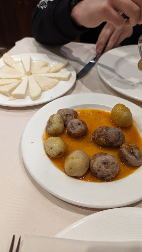 I have a degree in Spanish and I lived here for a year. So I understand what's going on, although I speak with an accent. The waiter seemed to not realise this. We ordered 2 glasses of cava. Simple enough. He asked whether we wanted rosado - rosé. OK, sounds good. He brought the cava. It was ordinary, white cava. When he brought the food, morcilla and tortilla, he said "sopa y turrón" (soup and nougat). Oddly, even though I had ordered everything in Spanish, he seemed to think I wouldn't understand him when he spoke in Spanish!