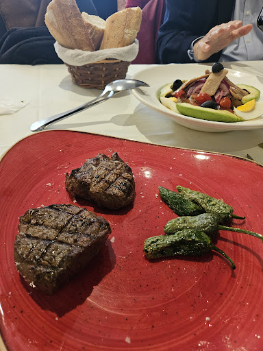 Pochas con almejas Estaban muy buenas. Pedimos una ración entre dos personas y aun dividiendolas las raciones eran considerables. Solomillo de ternera Buena carne y cocinada al punto. Es una gran opción. Ensalada de la dehesa Sencilla pero muy completa, bien presentada y sobre todo bien aliñada. Me gustó mucho. Gambas al ajillo Plato correcto. Difícil hacerlo mal con este plato. Delicias de merluza Buena opción también. Viene con papas fritas por lo que no es el plato más saludable pero por lo menos está bien hecho. Huevos mole Estaba bastante conseguido el postre. No hay mucho donde elegir por lo que con este no fallas. Melón y fresas Preguntamos si tenían fruta y esto fue lo que nos ofrecieron. La fruta en sí estaba buena y por lo menos te dan una solución.