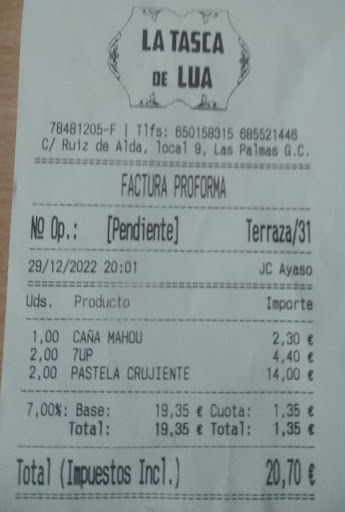 Read moreEstuvimos el 29 de diciembre en la Tasca Lua. La terraza estaba COMPLETAMENTE vacia. Eran como las 7pm. Pedimos, como se puede ver en la foto mostrando la cuenta, y despues de pedir otra bebida, el individuo (dueño) vino a nuestra mesa a las 8:01pm y nos tiró la cuenta encima de la mesa (literalmente, la tiró) y dijo: 'paguen ya que necesito la mesa porque tengo gente esperando' Nos quedamos flipando de la falta de educación, maneras, de todo. ¡Estabamos aun terminando nuestras bebidas! En ningún momento al llegar a las 7pm nos dijo tal individuo que la mesa estaba reservada, ni que a partir de tal hora teniamos que irnos, NADA. Y cuando no nos fuimos (estabamos terminando las bebidas), el tipo vino a acosarnos para que nos fueramos. Sinceramente - EVITEN este sitio.