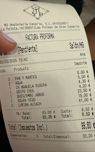 The waitress's attention was practically nonexistent. We were seated, ordered, and waited for our food to arrive. When it finally did, we were shocked to discover that our orders were incorrect. I ordered the Las tres maravillas de jabugo 100% iberico and tabla de quesos canarios but received a mix of 6 slices of salami and chorizon instead with 2 slices of cheese. Also they didn’t put enough cutlery for 3 people and I had to ask 5 times for the glass of water that the waitress kept forgetting.