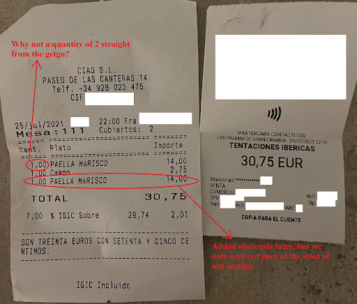 Then we wanted to pay our bill, so one of us went to the counter to pay it and also we wanted to leave our appreciation (a 20% off tip) since up to that point the service was alright. My fiancée handles the situation since her Spanish is better than mine and when she wanted to pay we encounter our worse experience in the Canary Islands. The server just informed her that the Paella that we were served is for 2 (no surprise in here since it was written on the menu as well) and that he actually ordered the chef to put more content in that Paella since is for two and he has to bill us actually two Paellas, which wasn't our intent from the get-go. Since the message came as a surprise for my fiancée she actually paid for those two paellas instead of one, leaving also the 20% tip, and we realized a little bit after that we got tricked when we wondered our-self of what happened. Retrospectively, another sign that we were tricked was when a piccolo delivered our order, not the server, and the piccolo looked a bit unhinged at the fact that at the table are two persons and he brought just one Paella with no additional dishes whatsoever. Later on, the server got the dishes to properly enjoy our meal.