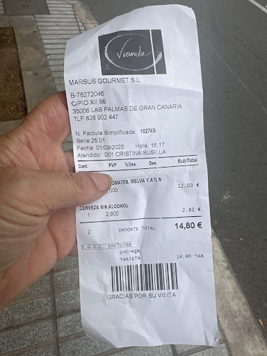 Read moreMe pregunta q me ha parecido "Vianda Gourmet", Bien ante las circunstancias, en la q X estas fechas nos encontramos, las superficie en la q se desenvuelve, el negocio y adaptándonos los clientes a ello, es un lugar con una terraza y un personal, muy agradable. Ahora bien, había estado en varias ocasiones, antes de ésta " pandemia" y me gustaba mucho más siendo el personal, quien siempre me ha tratado muy bien. En otra visitas anteriores, sus precios me parecían, muy normales X ejemplo: Yo al acostumbrar, a tomar buen vino, q dicho sea de paso, poseen muy bueno, en otras ocasiones tomo alguna cerveza, como el día de hoy, pero en pasadas ocasiones, tanto el buen vino, como la cerveza, sus precios bastante asequibles, sin embargo esta última visita, la de hoy día 19/05/2020, los mismos me han parecido abusivos, pues una cerveza q tomo en varios bares y restaurantes, de la misma categoría e incluso superiores, cuando en estos la tono entre, 1,70€ y 2,50€, la más cara precio antiguo. Hoy X una cerveza de la misma categoría, la más barata he pagado 2,30€. En lo q a mí respecta, no creo q vuelva a visitarles X mucho tiempo, algo que invito al resto de sus clientes, pues con esos precios, a 150mt. Hay otros establecimientos, con la misma o superior materia y a mejor precio! P.D.- Si X alguna casualidad, me veo obligado a visitarles, no duden q si sus precios, me parecen abusivos, les exigiré la lista de precios y di no la tienen, pasaría al paso siguiente y edo ya sabemos lo q...