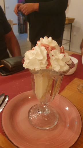 Nos invitaron al postre, que Samira con mucha ilusión nos trajo: una tarta en copa de dulce de leche que, si no hubiésemos estado llenísimos, nos habríamos terminado y rebañado.