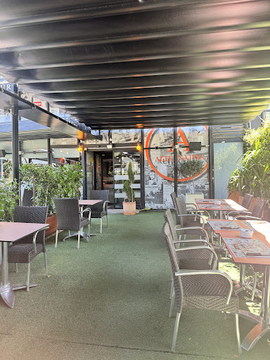 Restaurante/bar/pub con buena ambientación que tiene tanto sala interior como una terraza exterior.