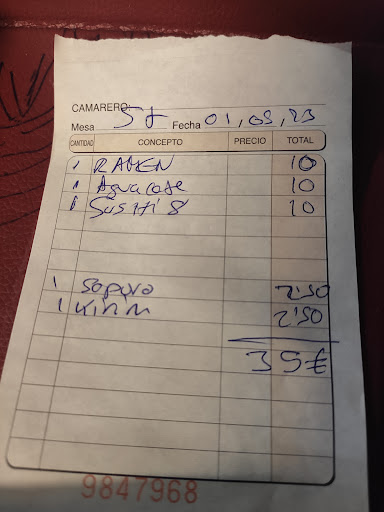 Read moreRestaurante con local pequeño formado por un equipo de tres personas, con una calidad de materia prima bastante aceptable a buen precio. La elaboración de los platos es lo que podría mejorar: el atún del tratar bastante machacado en lugar de cortado, el sushi y el sashimi cortado demasiado grueso y la tempura sin embargo cortada demasiado fina y con mucha harina. Nos extrañó que en el menú de sushi variado vinieran un par de piezas de niguiris para cada uno, sashimi variado y ni un solo maki. La ensalada de algas, pollo y gambas de entrante estaba muy rica. De cantidad bastante generoso. La decoración no invita demasiado a entrar, ya que las paredes son de pladur sin pintar y llenas de mensajes y dibujos a boli de la gente....