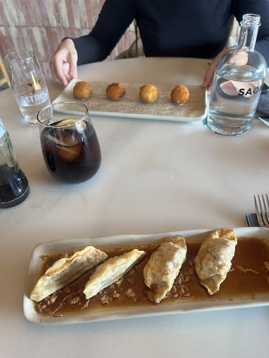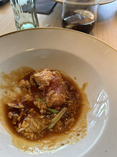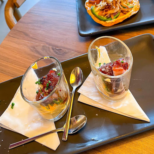 Tiene una serie de aperitivos fijos que no puedes elegir como primer plato digamos. Las croquetas de pato, lo mejor de los entrantes, un sabor muy rico a pato, con la salsa Hoisin que le da un toque espectacular, de veras, y muy cremositas por dentro. El pulpo estaba suave de textura pero a nuestro gusto súper salado, por el aderezo además de la sal gorda que lleva. La ensaladilla rusa con huevo bien de sabor, rica. La coca también con buen sabor, con una masa esponjosa y buen rellenita. La tortilla de tataki de atún, la valoramos menos en sabor ya que no somos muy de sushi (o pescado con este tipo de elaboración o parecida), decir que el atún no quitaba sabor al resto de ingredientes y había bastante mezcla de texturas y sabores.