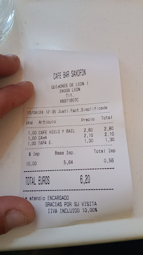 Tras llegar a la estación de RENFE de León, me decidí a buscar un bar para picar algo antes de proseguir con mi viaje. Resultado un sitio acogedor con una atención muy dedicada y servicial. Me atendió Morgana, una mujer excepcional con ganas de hacer muy bien su trabajo. Muy atenta y amable con una sonrisa muy bonita. Gracias Morgana. Me sirvieron 2 tapas 1 caña 1 café 1 copa Baileys 1 tapa de torrija. Además de que todo estaba muy bueno, me cobraron 6,20e por todo. Recomiendo este local, tanto si pasas por allí como si buscas un sitio en concreto para salir a tomar algo; además es muy buena opción para todos esos viajeros que hacen escala en León y tengan que hacer algún transbordo y tengan que parar a picar algo. Gracias por vuestra experiencia Bar Saxofón. Nos volveremos a ver en mi próximo...