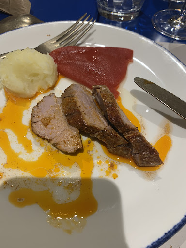 La comida del menú degustación era abundante, y sabrosa. Lo único que nos llamo un poco negativamente la atención fue la morcilla y el chorizo, ya que acostumbrados a comer esta en otros de sus restaurantes, en esta ocasión nos parecia muy apagado su sabor. El bacalao que le sirvieron a mi madre como plato principal, era una tajada muy grande y hermosa, pero.. demasiado salada, al punto de no poder comerla. Sin embargo el resto de platos, estaban deliciosos a más no poder. Las carrilleras que era mi plato principal, exquisitas, y las patatas con congrio y almejas totalmente espectaculares. El postre tambien nos encanto, las rosquillas de San Froilan con un helado acompañandolo.