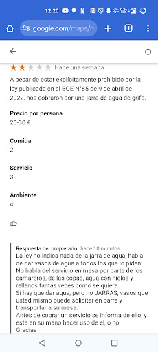 Y ahora añado para poder responder a su respuesta: Esa es una interpretación que hace usted de la ley 7/2022. La ley efectivamente no dice nada de jarra, tampoco habla de vasos ni de ningún tipo de recipiente. Usease que quizá y según su interpretación ¿el legislador pretendía que cogiese el agua entre las manos? La ley dice esto literalmente. Copio y pego: "Con ese mismo objeto, en los establecimientos del sector de la hostelería y restauración se tendrá que ofrecer siempre a los consumidores, clientes o usuarios de sus servicios, la posibilidad de consumo de agua no envasada de manera gratuita y complementaria a la oferta del mismo establecimiento." Como puede ver no dice nada de vasos ni jarras ni nada. Simplemente dice que usted debe ofrecer la posibilidad del agua no envasada. Primero. Usted no ofreció el agua no envasada tal y como establece la ley. Segundo. Se la pedimos explícitamente y usted (o un empleado)efectivamente nos indicó que nos la cobraría igual. No nos dijo nada de que si fuésemos nosotros a por ella a la barra en vasos no nos la cobraría o cualquier otro condicionante que a usted se le ocurra, tal vez que fuésemos a por ella haciendo el pino, no sé, por pedir, como no viene explicitado en la ley.... Tercero. En nuestro ánimo, como así le indicamos, no está el ahorrarnos unos eurillos. Nuestro ánimo es el mismo que indica la ley y así se lo dijimos. Lo hacemos por un tema de evitar más residuos. De hecho si se tratase de dinero le hubiésemos pedido la hoja de reclamaciones y no lo hicimos porque no era esa nuestra intención. Nuestra única intención era evitar el tema de los residuos, y lo cobrase usted o no eso lo conseguimos. Y por último,sabe usted de sobra que está contraviniendo la ley y por eso en el tique de venta no indica que se trata de agua no envasada, o de jarra de agua, o de servicio de jarra de agua. Porque eso ya sería dejarlo por escrito. Usted lo ticó como "AGUA" para que si nosotros presentasemos una reclamación cubrirse las espaldas, supongo. Repito. Nada más lejos de nuestra intención que la única era evitar el tema de residuos. Ahora bien. Si quiero dejar aquí plasmado su manera de hacer y de cómo contraviene la ley. Quizá alguien si acabe pidiendo la hoja de reclamaciones y entonces ya le explicará la autoridad competente como aplicar dicha...