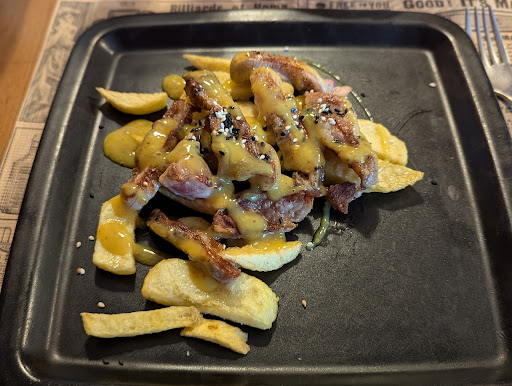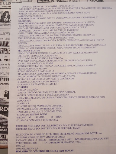 Read moreBuena atención, servicio rápido, buena comida a buen precio. Solo tienen menú del dia de lunes a viernes. También tienen el menú del día para llevar. El menú lo cambian a diario y tienen muchos platos tanto de primeros, como segundos y postres. Nosotros pedimos: macarrones gratinados (buenísimos), tallarines estilo thai (que estaban muy buenos), carrillera iberica guisada (muy buena y tierna y con patatas fritas caseras) y escalopines de ternera con salsa azul (la salsa estaba suave de sabor y la carne tierna y con patatas fritas caseras). De postre: tarta de chocolate con galletas (la tarta de la abuela con el sabor de siempre) y hojaldre relleno de crema con chocolate (le faltaba un poquitín más de relleno pero estaba bien) Posiblemente sea el restaurante de la ciudad con mayor variedad de platos en un menú del día. Seguidnos en redes: INSTA @nosprestacomer TIKTOK...