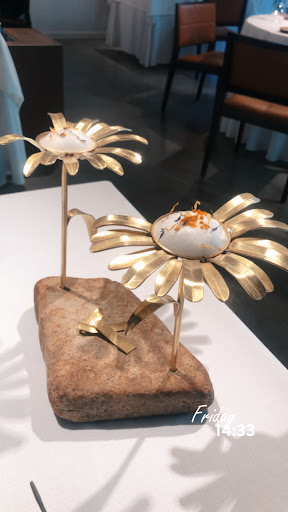 Read moreFuimos a comer en pareja a este restaurante. Hay que decir que el comedor es muy bonito y elegante, y que el servicio del personal es muy bueno. Intentan estar pendiente en todo momento aunque a veces tengas que esperar un buen rato a que te rellenen la copa. Los platos se ven que son elaborados y tienen muy buena presentación tanto de los alimentos como de la propia vajilla, pero sinceramente no hubo ni un solo plato que nos emocionara. En realidad eran bastante decepcionantes, la mayoría carentes de sabor y los que tenían un mínimo gusto eran sabores muy planos y nada novedosos. Te sirven un plato de escabeche donde el propio escabeche se come el resto y sólo sabe a eso, pero es que el siguiente plato que es diferente lo vuelven a poner con escabeche y el sabor sigue siendo el mismo ( uno vale, pero dos ....). Igual que con los postres. De tres postres dos de ellos son simplemente un helado.... Diferente sabor mismo plato y por supuesto nada original. Pero lo más grave de toda la comida fue cuando nos sirvieron unos raviolis de perdiz desmigada y tenían muchísimos restos de huesos e incluso un pedazo de perdigón. Esto es totalmente indefendible en un restaurante con una estrella Michelin. Lo dicho, el menú no estuvo a la altura y fue...