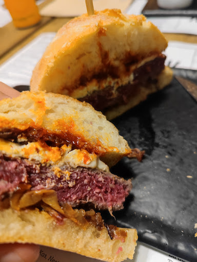 Excelente y buenísimo. Estuve un jueves para cenar, es un sitio idóneo para ir en pareja o en grupo con un estilo muy particular a la par que minimalista y sofisticado. La comida estaba buenísima con un entrante de tequeños excepcional con una salsa/mermelada de pimientos y tomate mejor aún. Respecto a las bebidas no sabría indicar muy bien ya que lo acompañamos todo con unos refrescos. Siguiendo con el plato principal, pedimos dos hamburguesas de carne de vacuno (poco hecha y al punto) acompañadas con patatas chips artesanales y frescas. La calidad de la carne es muy buena con muy buen sabor sin necesidad de añadir salsas típicas adicionales como en otras hamburgueserías. A recalcar que la carne al punto sin sangre estaba muy bien cogida y muy bien realizada, nada que envidiar a restaurantes de mejor valoración profesional. Por último terminamos con un postre para compartir, una espectacular tarta de queso casera (en este caso sin mermelada de fresa artesanal por selección propia) sin nada que envidiar y de las mejores tartas de queso referente a textura y sabor que he probado (y no son pocas 😜😂). En resumen, un lugar excelente donde probar una muy buena opción en grupo o en pareja, sin duda...