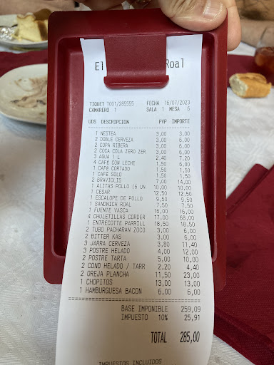 Hemos comido a la carta en fin de semana. Hay posibilidad de comer arroz que es su especialidad pero en esta ocasión nos decantamos por la carta. Éramos 11 personas y para empezar pedimos unas raciones: una de chopitos, dos de bravas y dos de oreja para compartir, decir que las raciones son abundantes y la patata es casera nada de congelados. Para el plato principal pedimos: cuatro de chuletas de cordero, una hamburguesa, una ración de alitas, una de filetes empanados de pollos, una ensalada cesar, una fuente de bacalao entra mucha cantidad es para dos personas y un entrecot decir que no preguntaron en punto de la carne Todo buenísimo pero el bacalao entra mucha patata y poco bacalao. El...