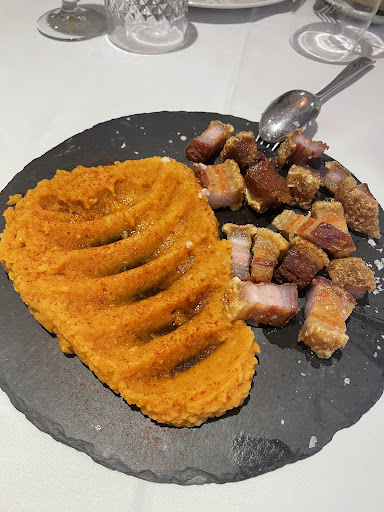 Este sitio merece las 5 estrellas sin duda: comida espectacular, atención impecable y ambiente acogedor y tranquilo. De entrante pedimos dos torreznos que sin palabras (crujiente por fuera y tierno por dentro), trinchados en tu presencia y acompañados de un puré de patatas con pimentón que rebañamos con el pan. Luego pedimos la ración de croquetas de jamón que estaban cremosas, no sabían a harina y estaban bien tostadas, acompañadas con patatas pajas caseras, que se agradece. Luego vino la morcilla con piñones también con patatas paja que quizá fue el más flojo de los entrantes pero es que competir con los torreznos y las croquetas es difícil, pero el sabor de la morcilla era muy bueno. De plató pedimos arroz con bogavante nacional, que se veían perfectamente las pintas de la cáscara, acompañado de gambas y almejas, el arroz en su punto y con saborazo, servido en la mesa primero por la camarera y luego dejando la cazuela para seguir comiendo. Simplemente una delicia. De postre pedimos la tarta de queso y unas filloas. La tarta estaba suavecita y jugosa, pero quizá me gustan más las de horno. Las filloas… en fin, una pasada, además con nata montada de verdad, no de bote. Todo esto con una atención de los camareros agradable, atenta, conociendo los productos de la carta y aconsejando bien. Este sitio ha sido un descubrimiento y sin duda volveremos. Éramos 4 personas y salimos a 40 euros por cabeza incluyendo bebidas y...