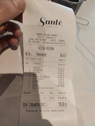 El lugar es espectacular, realmente es un restaurante de cocina DISTINTA a las típicos platos de raciones de bar que hay en Leganés . La cocina de santé tiene sabores sutiles, que resaltan con el juego de texturas en sus distintos platos, tuvimos la oportunidad de probar en esta ocasión varios de ellos. A mi parecer de los que más me gustó fue los chipirones de pincho con texturas de maíz ( que gran idea combinar la dulzura del maíz con la frescura marina de los chipirones) y esos toques crocantes de maíz o palomitas, solo faltaría un crujiente de arepas jejej El de mi acompañante fueron los puerros , realmente la acidez del yogurt junto con la manzana y la dulzura del puerro hacen que sea un plato realmente asombroso, y ese toque amargo de algarrobo nuevamente completan todo el circulo de armonía tanto a texturas como sabores. ( Con sal negra) Adicionalmente probamos el tártaro, el cual lo hacen delante de ti. El taco de gambas de cristal con carrilleras Y 2 postre el helado de pistacho ( realmente increíble) Y top fue la panacotta con palomitas y caramelos salados y sal negra Si tuviera que escribir algo sobre el restaurante que pudiera mejorar , sería cambiar la forma en la que presentan la mostaza , y el precio de las 4 rebanadas de pan con ajo confitado y el uso de la sal negra. Sin lugar es un gran lugar para ir a comer y te recomiendo hagas tú reserva con tiempo Tienen tmb bastantes vinos que se complementarán con tu maravillosa experiencia